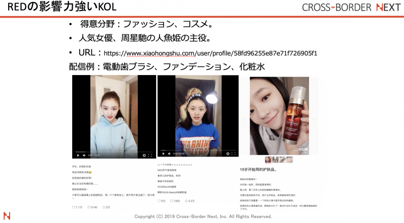 林允(リン・ユン)氏は小紅書(RED)KOLインフルエンサーの中でもTOPの影響力を誇ります。彼女の得意分野はファッションやコスメの紹介に強みがあります。中国国内での人気女優でもあり、チャウ・シンチー(周星馳)という中国で有名な映画監督が作成した「人魚姫」の主役でもありました。「人魚姫」はアジア映画歴代興行収入No.1を樹立し、世界で1億人以上の観客を動員した映画です。林允(リン・ユン)氏はこれまで、小紅書(RED)内で電動歯ブラシや化粧品などをよく紹介していました。