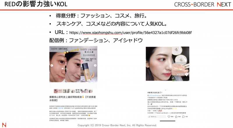 そこで今回、弊社クロスボーダーネクスト社では、中国KOLインフルエンサー事務所を運営しながら独自のツールを開発しております。そのツールには、中国KOLやインフルエンサーにまつわる独自のデータベースを保有。そのデータから、小紅書(RED)上における中国で影響力のあるKOLインフルエンサーを5名紹介していきたいと思います。